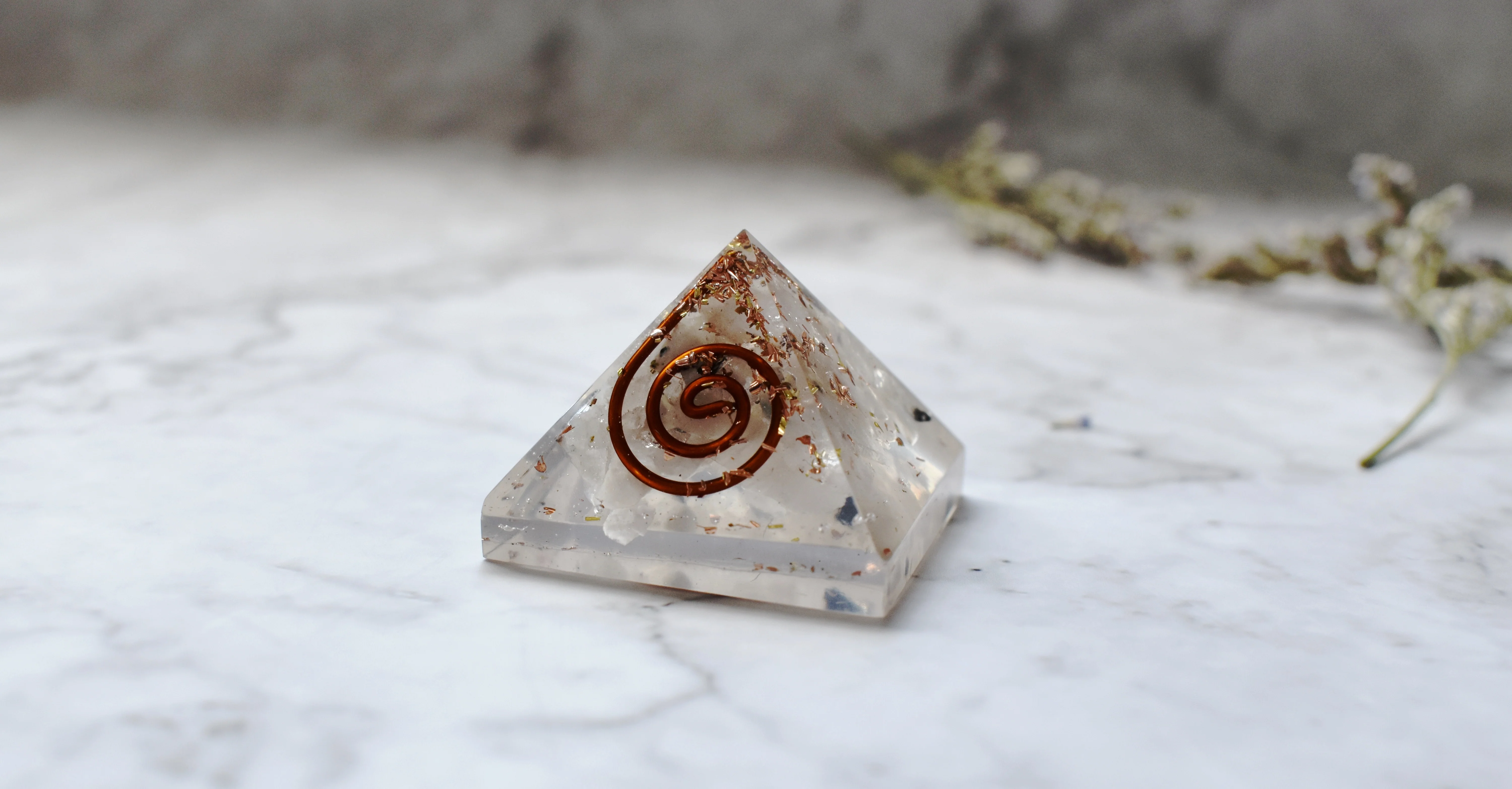 These magical little pyramids are made with natural rainbow moonstone crystals and metal swirls and shavings, all encased in resin. The pyramid shape helps to funnel the energy out of the point at the top, while the crystals and metal help to deflect and absorb negative energy. Each pyramid is 2.5 cm x 2.5 cm, making them the perfect size for carrying in your pocket or bag. So if you're looking for a little bit of magic in your life, pick up a Rainbow Moonstone Orgone Pyramid today!